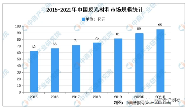 反光材料,廣泛應(yīng)用于交通標(biāo)志標(biāo)線、突起路標(biāo)、輪廓標(biāo)識(shí)、交通錐、防撞筒等各種道路交通安全設(shè)施,以及汽車號(hào)牌、衣物鞋帽、消防、鐵路、水運(yùn)、礦區(qū)等。隨著經(jīng)濟(jì)的高速發(fā)展,下游行業(yè)發(fā)展旺盛,推動(dòng)反光材料的發(fā)展。上海勞保技術(shù)展了解到,數(shù)據(jù)顯示,2019年中國反光材料市場(chǎng)規(guī)模達(dá)81億元。中商產(chǎn)業(yè)研究院預(yù)測(cè),2021年我國反光材料市場(chǎng)規(guī)模將達(dá)95億元。
